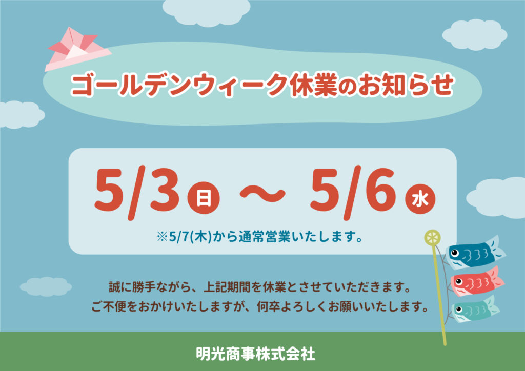 明光商事は、誠に勝手ながら5月3日~5月6日までお休みさせていただきます🙇🏻♀️前後の5月2日・7日は通常営業ですので、皆さまのご利用をお待ちしております!!